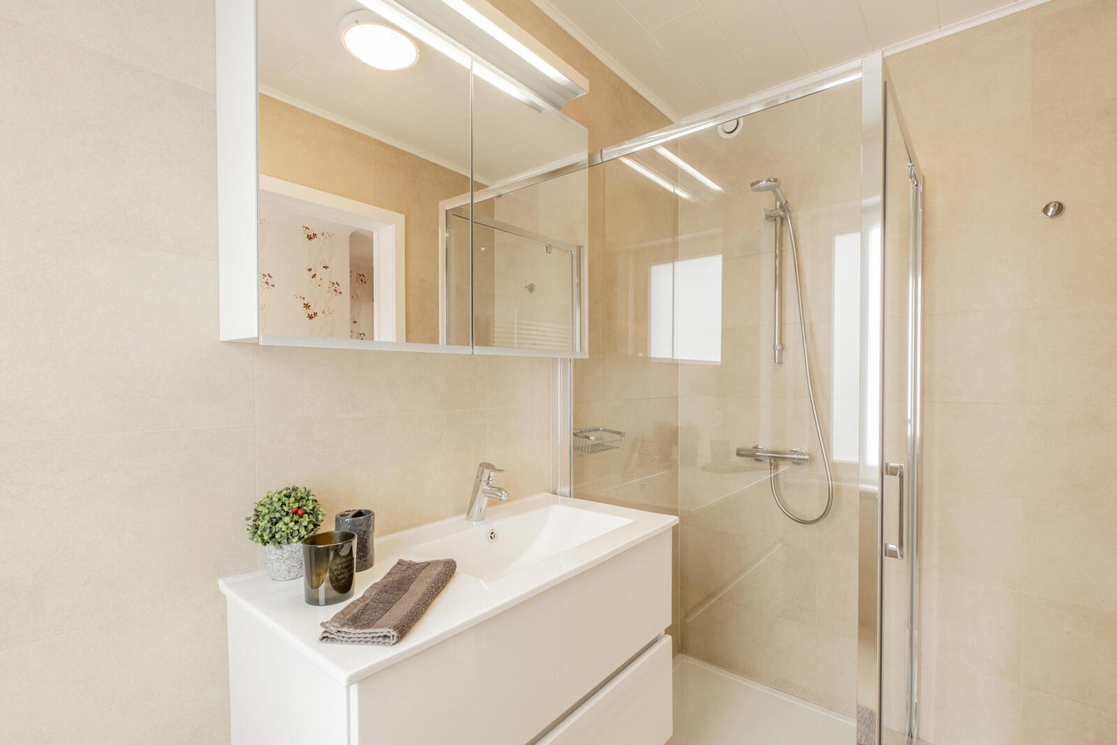 Cette maison comprend un hall d'entrée, un garage spacieux, un grand séjour, une cuisine ouverte avec tous les instruments, une grande terrasse, W.C., 2 chambres à coucher et une salle de bains spacieuse avec douche à l'italienne. Au premier étage se trouve le deuxième appartement avec salon, cuisine ouverte avec tous les outils nécessaires, une petite terrasse, une chambre à coucher avec placards, salle de bains avec douche à l’italienne et W.C. séparé.