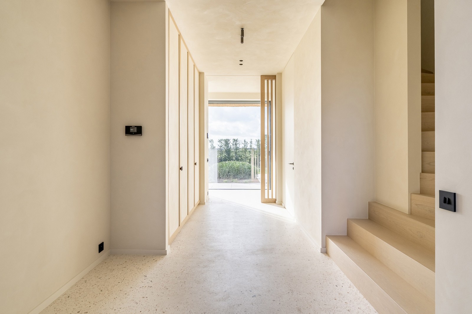 Le rez-de-chaussée comprend également un espace bureau/coin TV, une buanderie avec chambre froide intégrée ainsi qu’un double garage intérieur pour voitures et vélos.