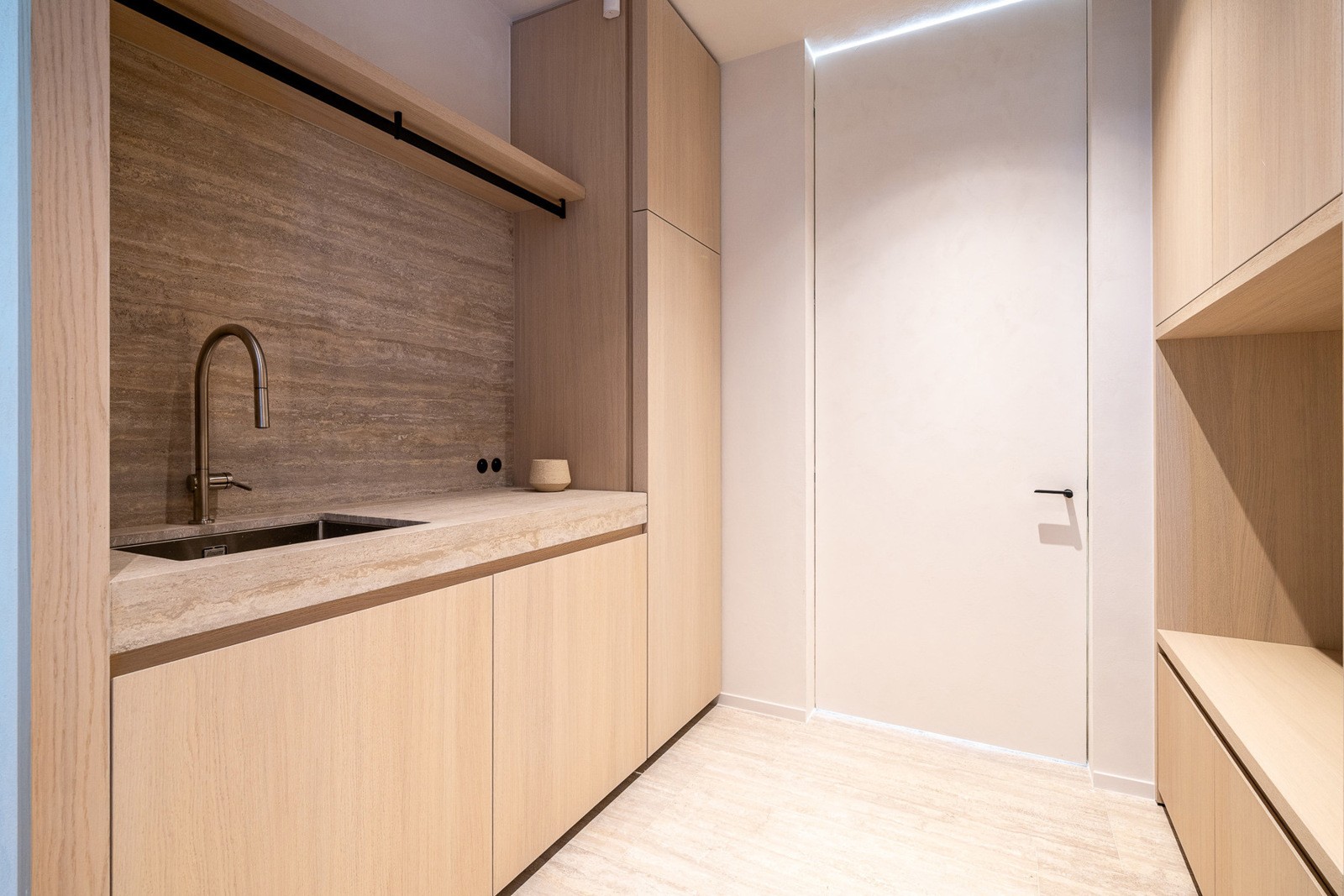 Hall d'entrée avec vestiaire et toilettes invités. Espace de vie spacieux et particulièrement lumineux comprenant un salon et une salle à manger, équipé d'une cheminée à gaz et de grandes baies vitrées donnant sur la terrasse et le jardin avec vue dégagée. Cuisine ouverte moderne et entièrement équipée avec îlot central. À côté se trouve une arrière-cuisine/buanderie pratique. Il y a également un débarras et un local technique. Garage pour une voiture et plusieurs places de stationnement à l'extérieur.