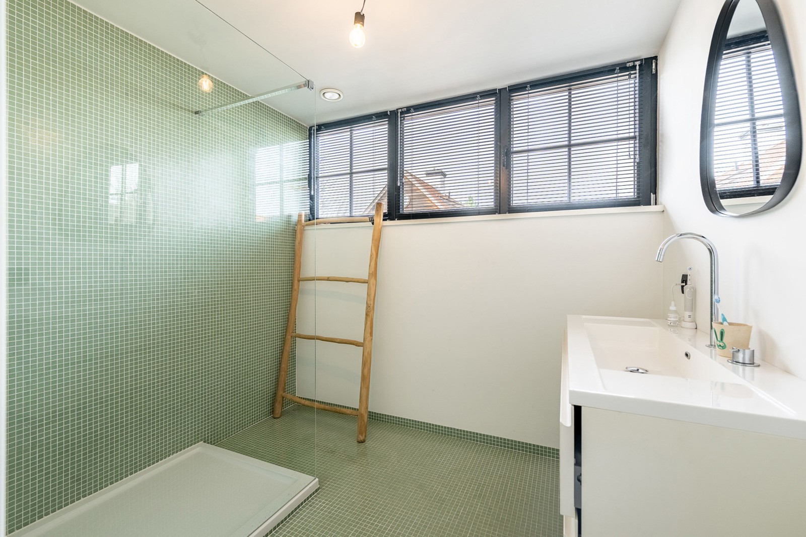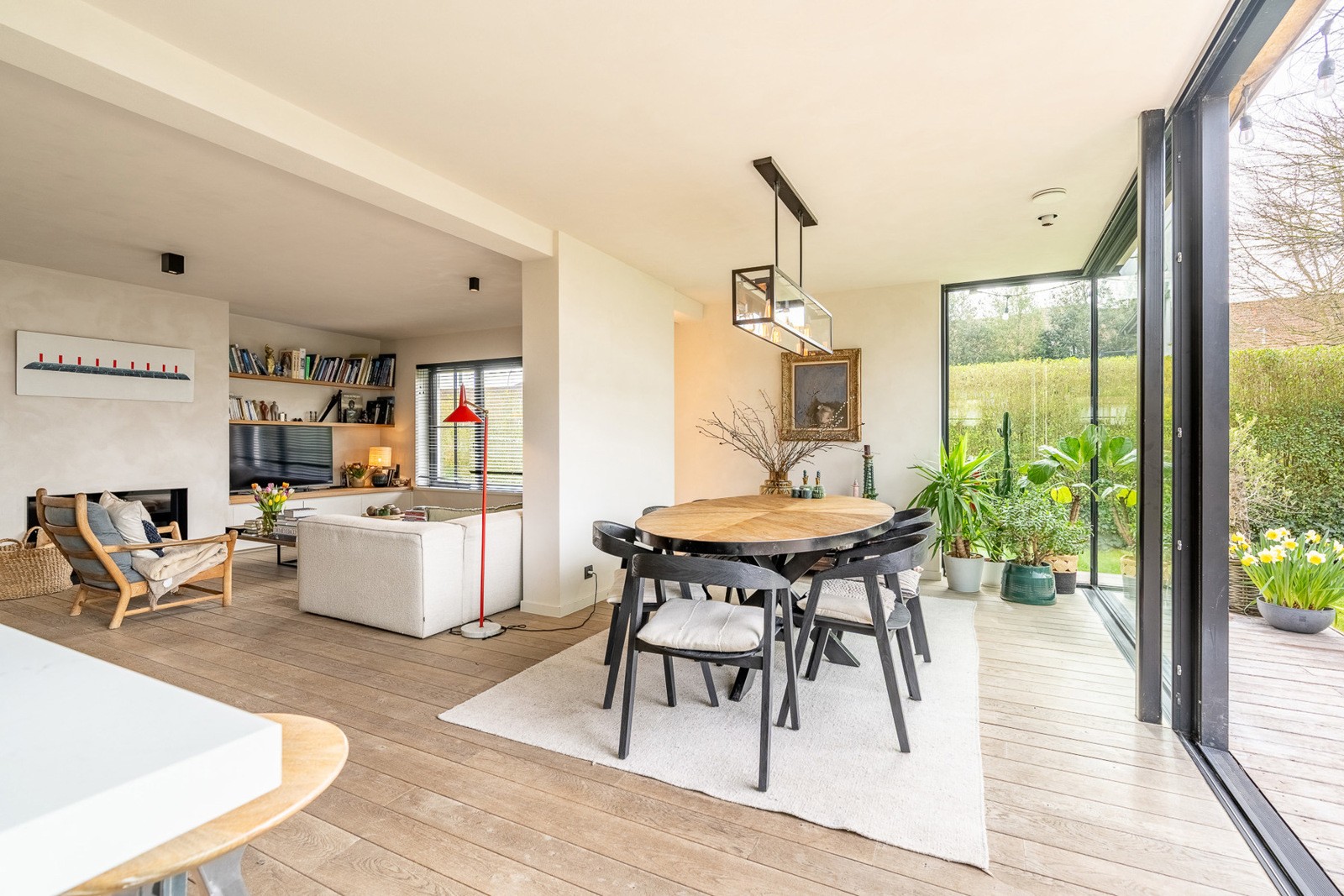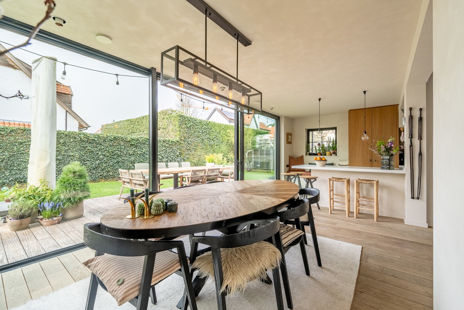 Aansluitend bevindt zich de ruime leefkeuken met directe verbinding naar de eetkamer, die uitgeeft op een aangenaam west-georiënteerd terras waar u optimaal kunt genieten van de namiddag- en avondzon. Op het gelijkvloers is er bovendien een praktisch bureau.